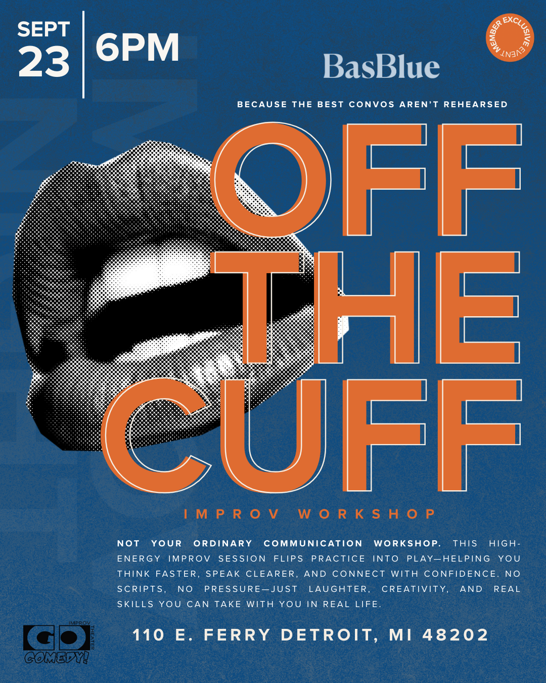 BasBlue 110 E. Ferry St., Detroit, MI, United StatesNot your ordinary communication workshop. This high-energy improv session flips practice into play—helping you think faster, speak clearer, and connect with confidence. No scripts, no pressure—just laughter, creativity, and real skills you can take with you in real life.
